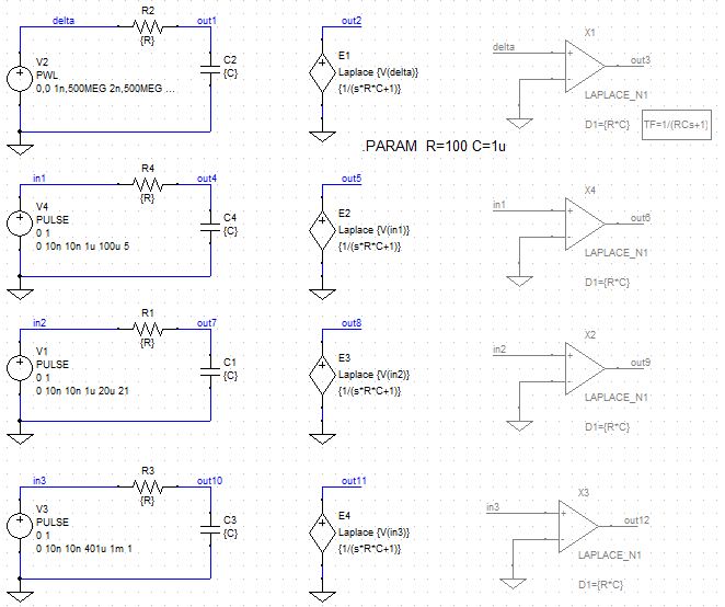 下記のファイルの後半でこの確認をしますが、単位インパルスは現実には実現不可能な関数(超関数の一つ)なので、SPICEでできる最大限の近似波形を作っています。またラプラス電源自体も、過負荷となる入力に対しては、理想的には動かないようです。以下の例では、TopSpiceでうまく動いた例を取り上げましたが、他のSPICEでは動かない場合もあります。その逆もありえますが、状態空間法モデルが使えればほとんどの場合、理論通り動作するようです。