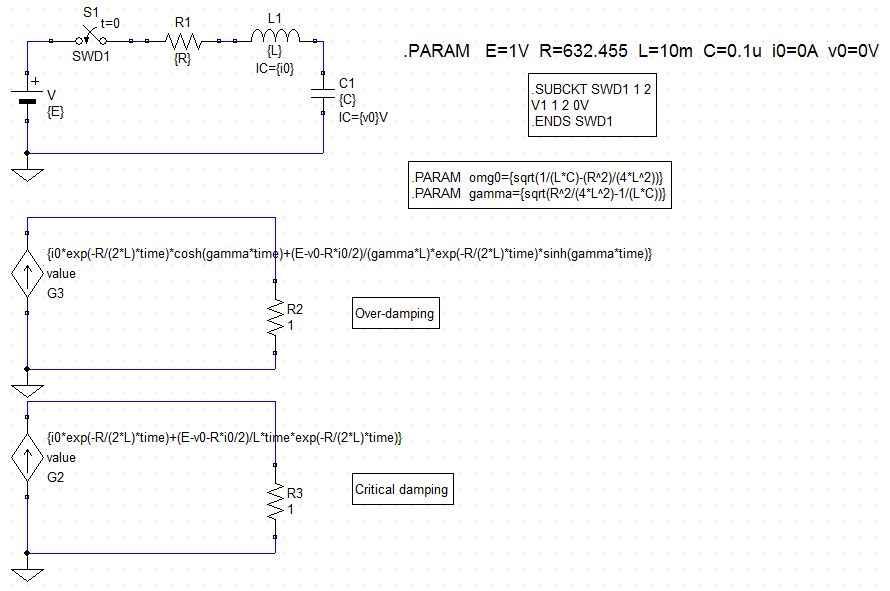 RLC直列回路にスイッチONで直流電源を印加した場合です。数式は、上記の(10.5)〜(10.7)式を使っています。この3つの式は、場合分けなので本来は同一ですが、これを一つのビヘイビア電源で表すことは困難なので、3回路として併記しています(上の拡大図では2回路のみしか表示していません。回路図ファイルには入っています)。RLC回路図の方は、Rを可変にして一つで間に合わせます。 |