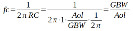 Aol:電圧利得(オープン・ループ・ゲイン、裸利得)とGBW:利得帯域幅積(≒ユニティ・ゲイン)というパラメータ値を、任意に設定して得られる一次ローパス特性を持っています。周波数特性が平坦部から利得が3dB低下(10・log(1/2)=-3.01dB)するカットオフ周波数(電力半値遮断周波数)fc