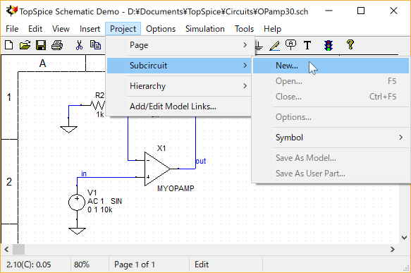 このシンボルの中身になるモデルは、全く別の回路図に作っても良いですし、同一回路図の2ページ目のシートに描いても良いですが、今回は小さな回路なので、同じシート上にサブサーキット回路図を描きます。他のSPICEにもある階層ブロックでも同様のことができますが、サブサーキットの内部を上位の回路図内に表示できるのは、TopSpice独自の機能といえます。なお、TopSpiceでは、階層ブロックの機能も別にあります。
