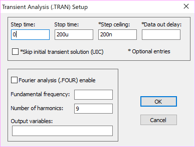 ceiling)を200nsとします(図7-15)。なお、過渡解析の時間分割幅となるステップ時間(Step time)は、他のSPICEに合わせてTopSpiceでもデフォルトの「0」のままでも可となりました。
